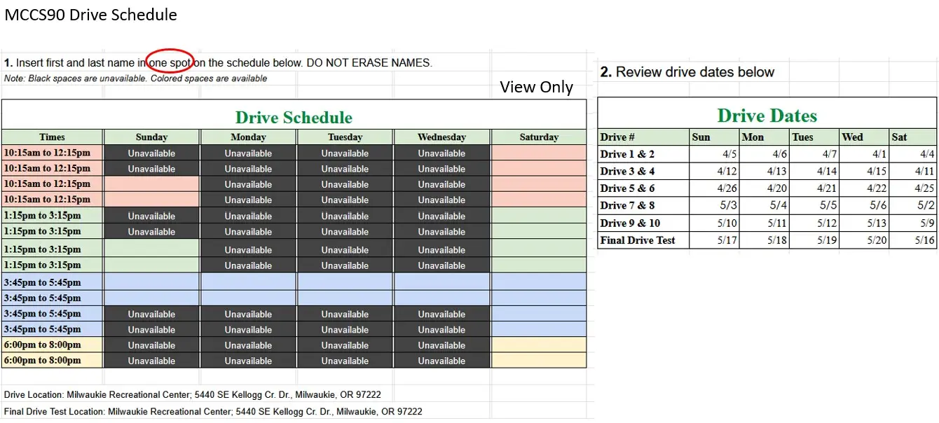 Drive Lesson Location: Milwaukie Rec Center; 5440 SE Kellogg Cr. Dr., Milwaukie, OR 97222